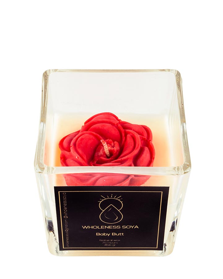 Λευκό κερί 200gr σε διάφανο τετράγωνο γυάλινο δοχείο 456gr, με οικολογικό φυτίλι και πορτοκαλί τριαντάφυλλο, για μια ολόκληρη εμπειρία πολυτέλειας και τρυφερότητας.