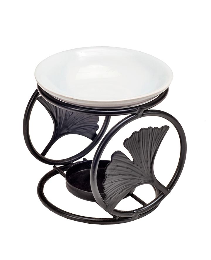 Μαύρος μεταλλικός καυστήρας με σκαλιστά φύλλα στα κυκλάκια και λευκό κεραμικό πιατάκι πορσελάνης. Ιδανικός για wax melts και αιθέρια έλαια, προσφέροντας πολυτελή αισθητική και αρωματική εμπειρία.